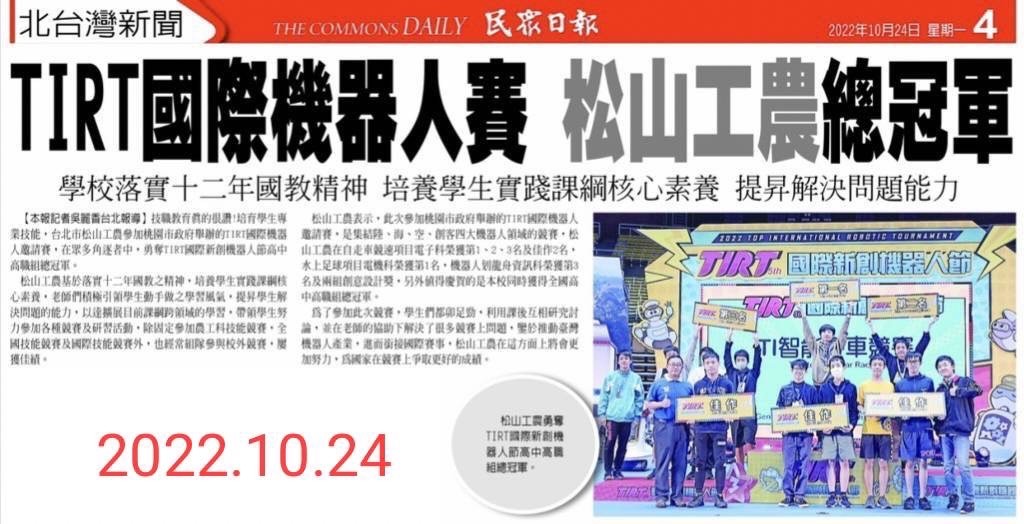 / 最新消息 / TIRT國際機器人賽 松山工農總冠軍