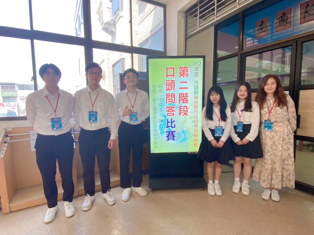全國高級中等學校112年專題實作及創意競賽複賽外語群專題組佳作,應用英語科306班余祐安、林元利、林昱宸、城越芸、張妤婕,指導老師王素琴